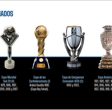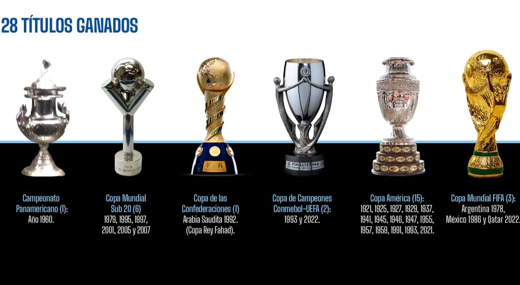 3 Campeonatos Mundiales durante los años 1978, 1986 y 2023; obtuvo los subcampeonatos de 1930, 1990 y 2014, conquistó la medalla de oro olímpica en 2004 y 2008, las de plata en 1928 y 1996, también logrando a nivel sudamericano coronarse con un total de 15 Copas América y seis mundiales Sub 20 entre 1979 y 2007.